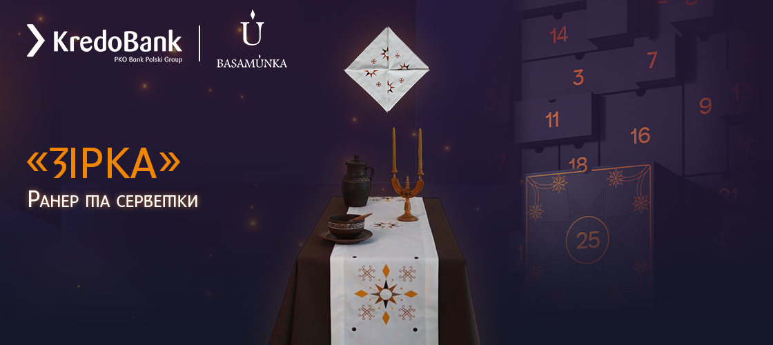 Ранер та 4 серветки з колекції текстилю «Зірка» є одним з 25 подарунків у Адвент-календарі від Кредобанку, які розіграємо серед клієнтів банку. Ставайте клієнтом банку, зробіть хоча б одну оплату карткою Mastercard та беріть участь в розіграші.